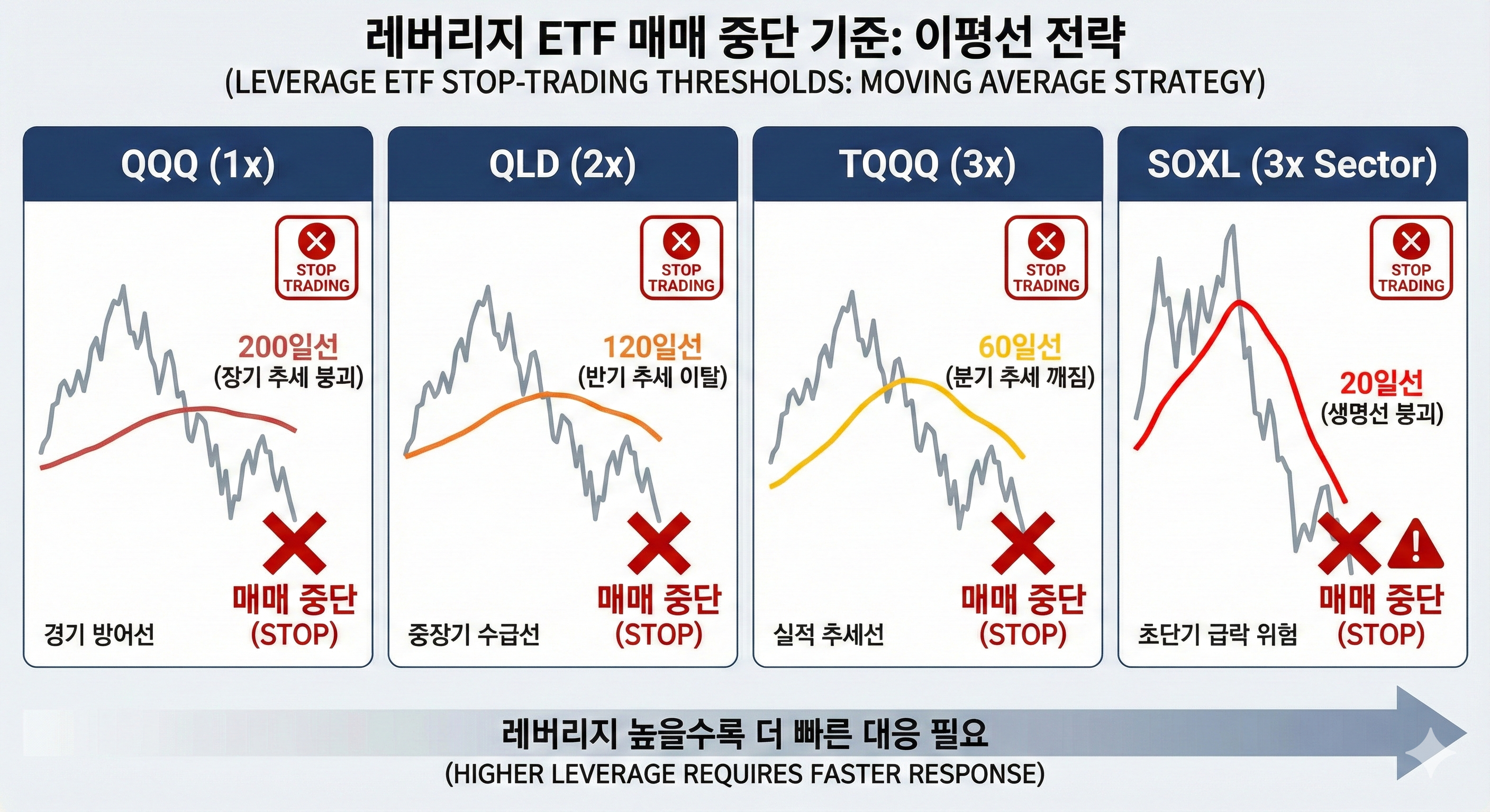 레버리지 배수가 높을수록 하락 시 손실 회복이 어렵기 때문에(음의 복리 효과), 더 빠르고 민감한 이평선을 기준으로 "손절" 혹은 "진입 금지" 원칙을 세워야 합니다.